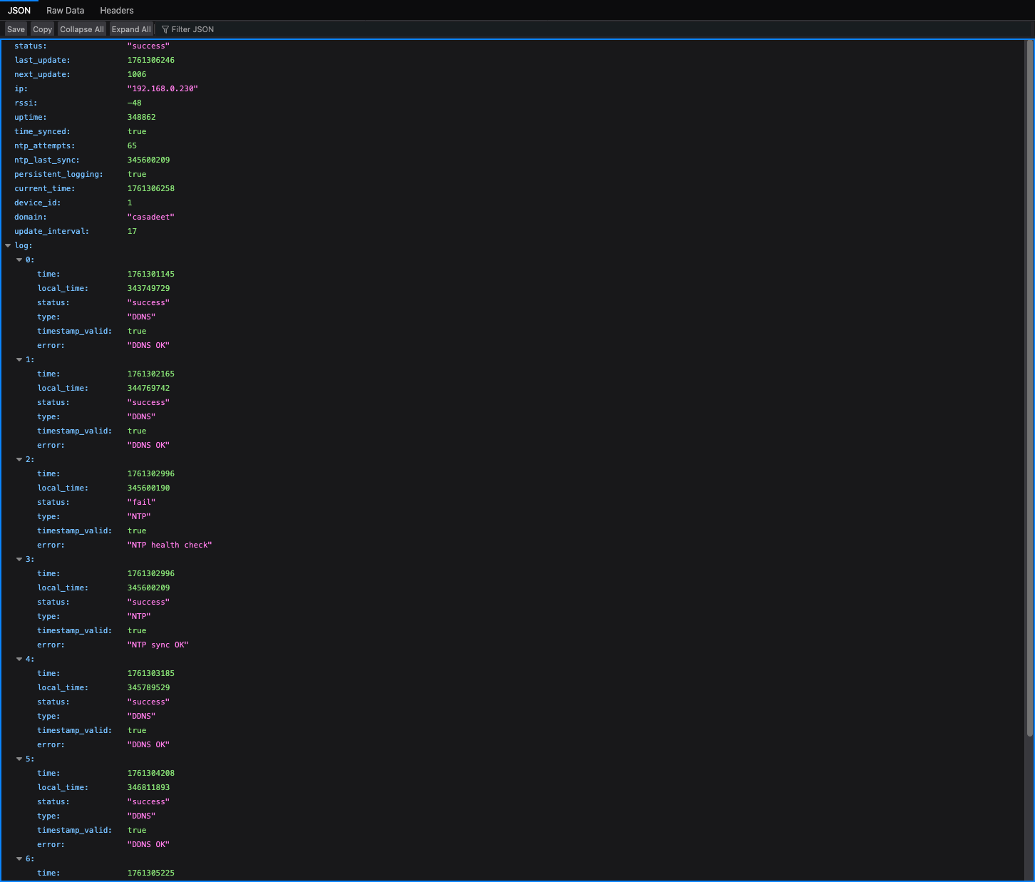 Config fields: * Device ID (0–999) * DuckDNS domain * DuckDNS token * Update interval (minutes) * Optional custom NTP server * Persistent logging flag