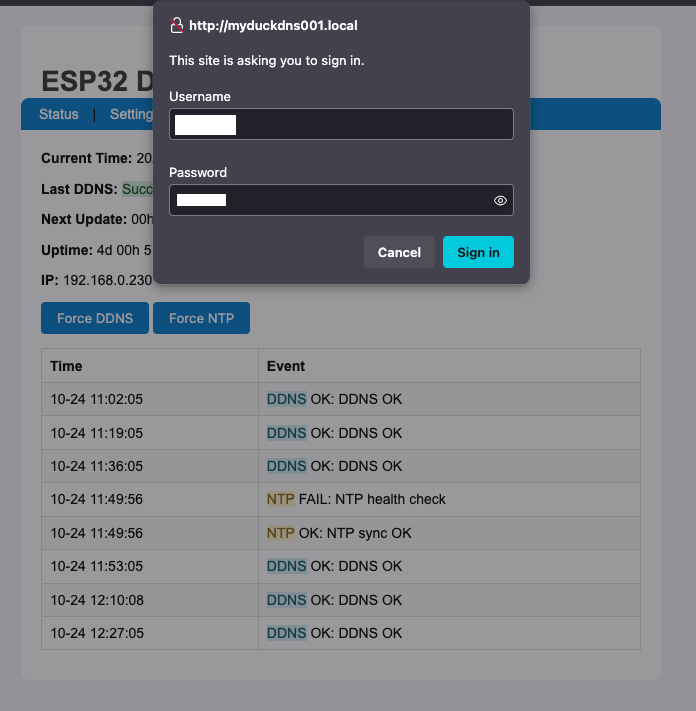 /— Status page (no authentication)/settings— Settings page (Basic Auth:user/pass)/forcesync— Force DDNS update (302 redirect to/)/forcentp— Force NTP sync (302 redirect to/)