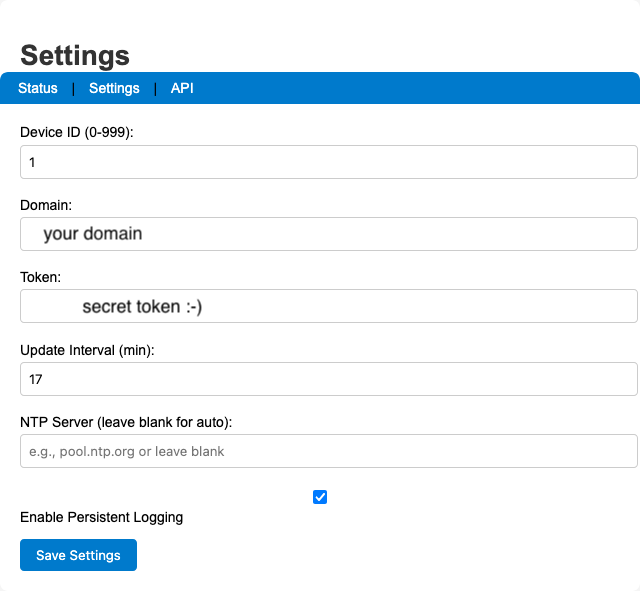 Defaults on first boot: * deviceid = 1, domain = "your-domain", token = "your-token", updateinterval = 10, ntpServer = "time.local", persistentLogging = false