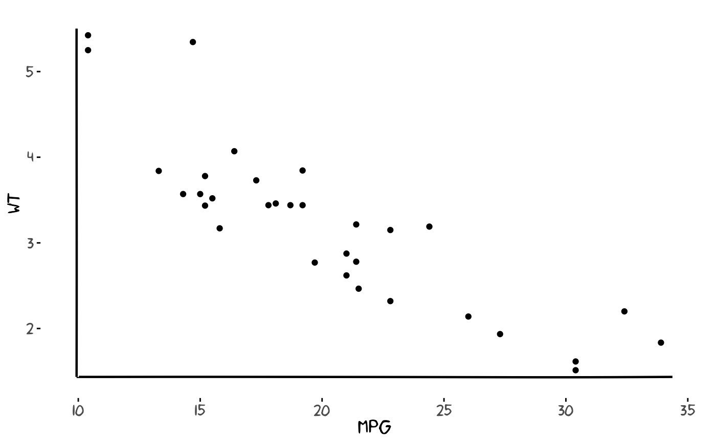 p <- ggplot() + geom_point(aes(x = mpg, y = wt), data = mtcars) +