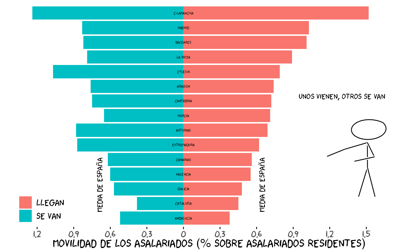 annotate("text", x = 9.3, y = 1.3, label = "Unos vienen, otros se van", family = "xkcd") +