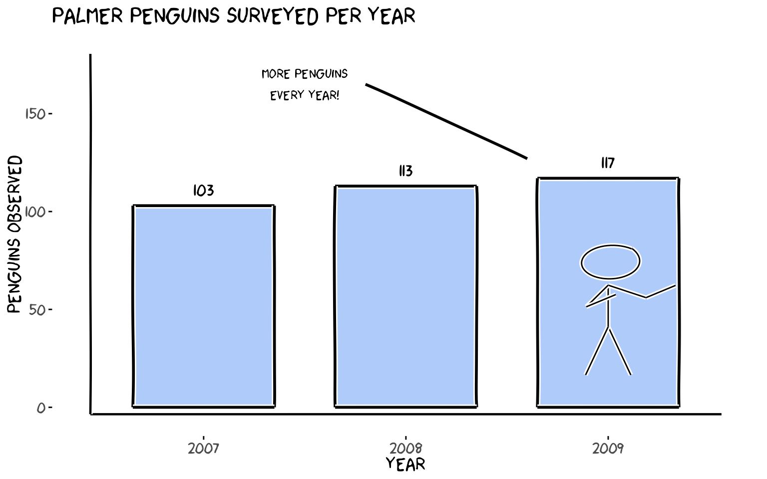 label = "More penguins\nevery year!", family = "xkcd", size = 4) +