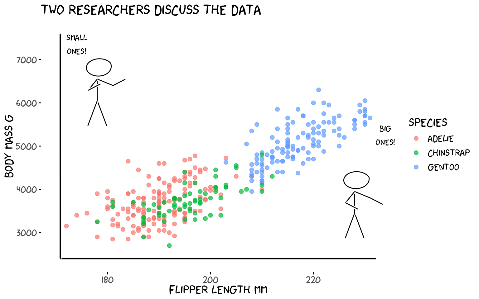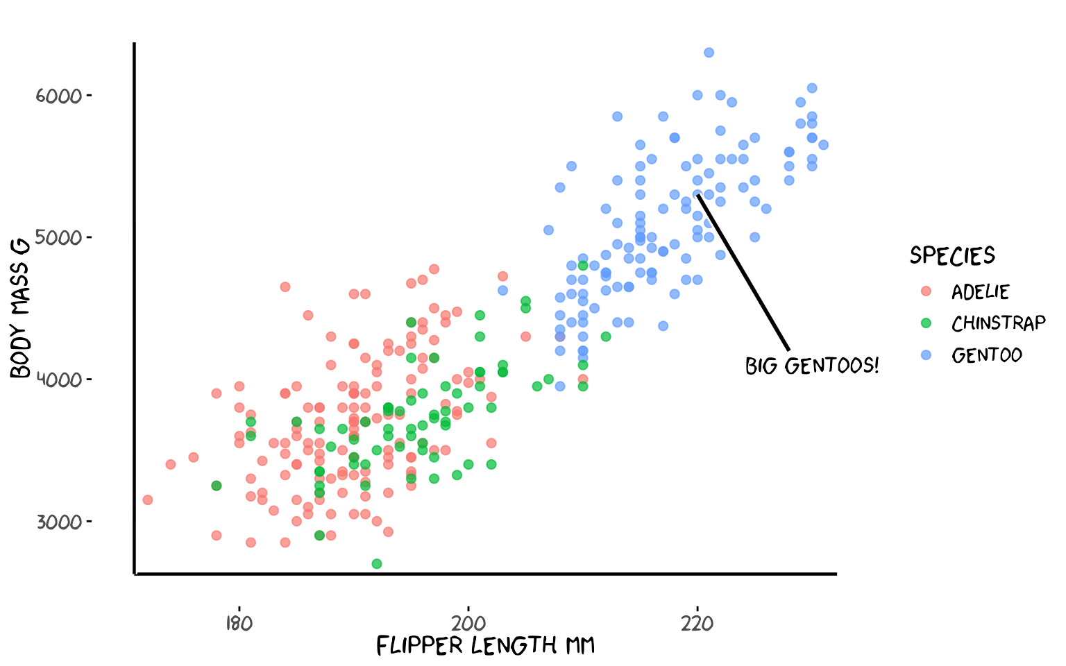 label = "Big Gentoos!", family = "xkcd", size = 5) +