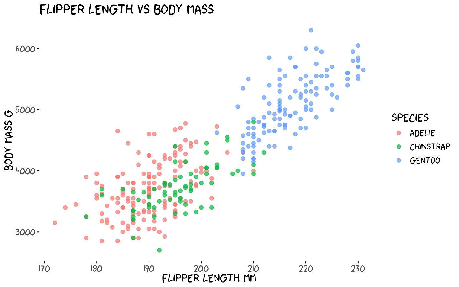ggplot(penguins, aes(flipper_length_mm, body_mass_g, colour = species)) +