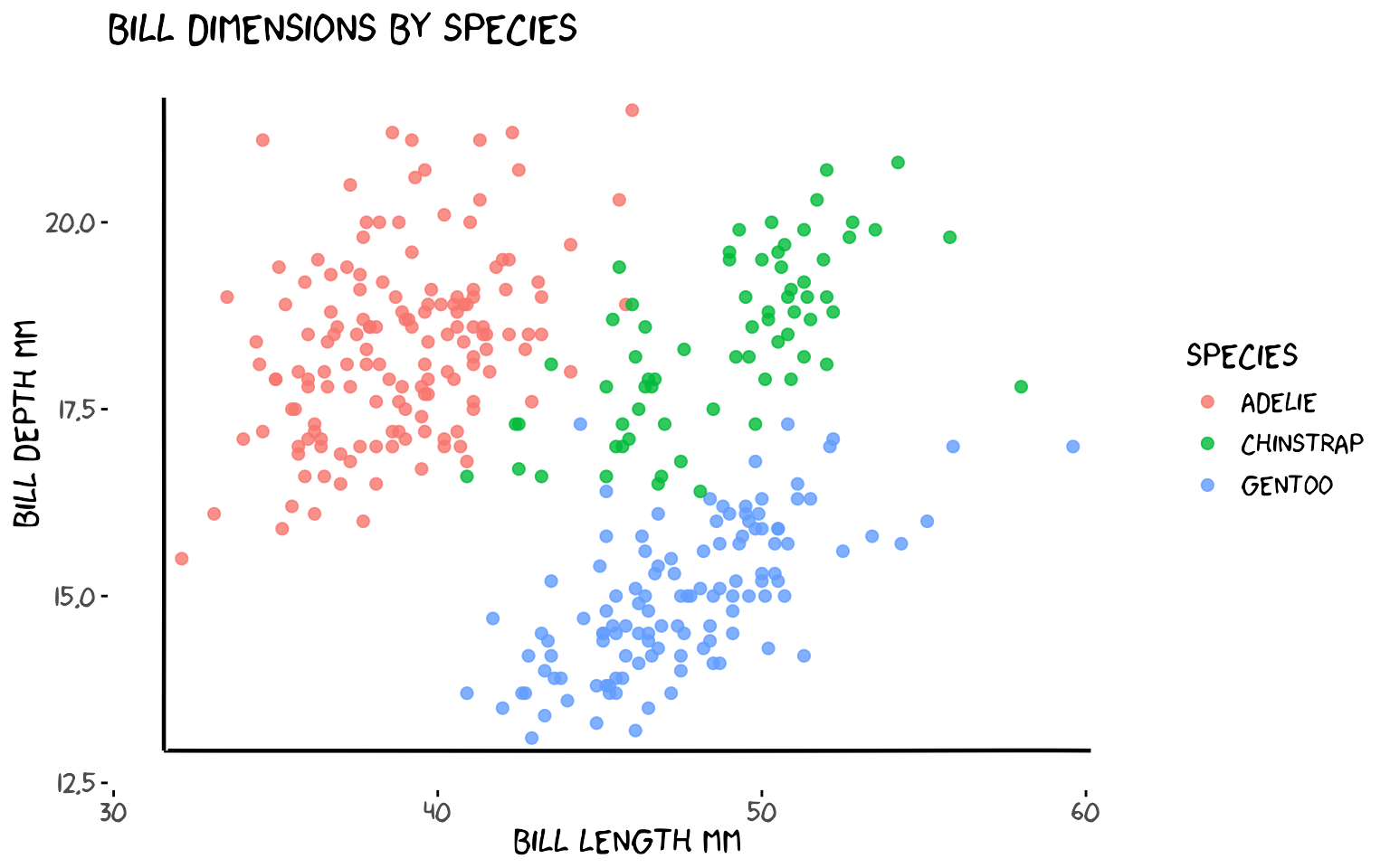 aes(bill_length_mm, bill_depth_mm, colour = species),