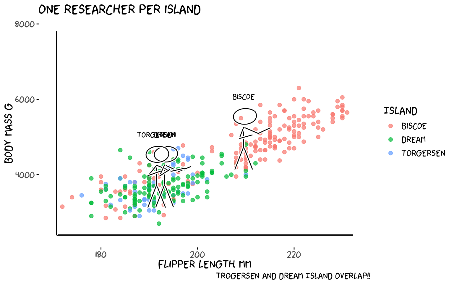 title = "One researcher per island",caption = "Trogersen and Dream Island overlap!!")